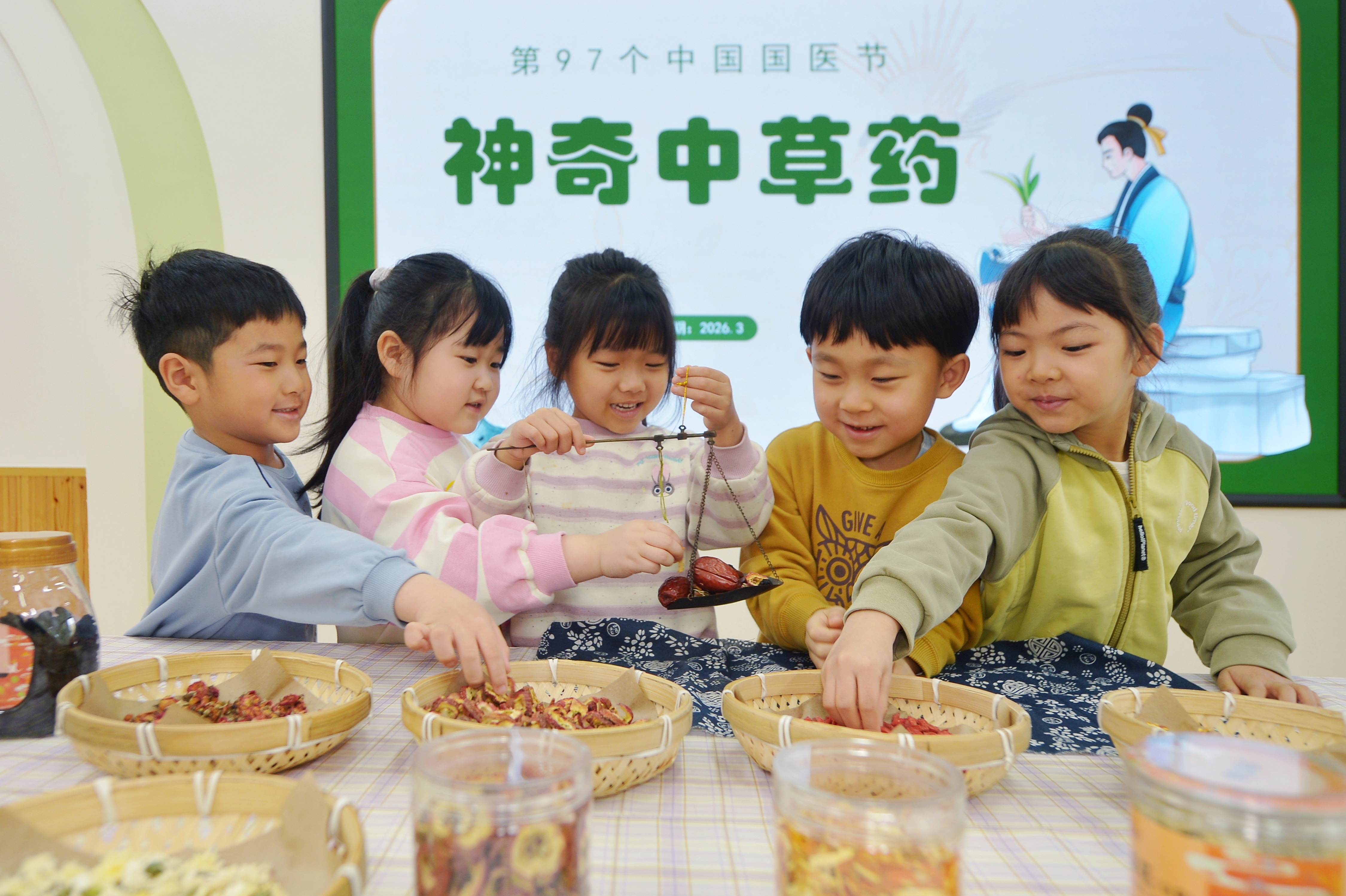 3月17日,开云·体育在山东省青岛市市北区桦川路幼儿园开展的“神奇中草药”主题活动上,小一又友们体验称药。