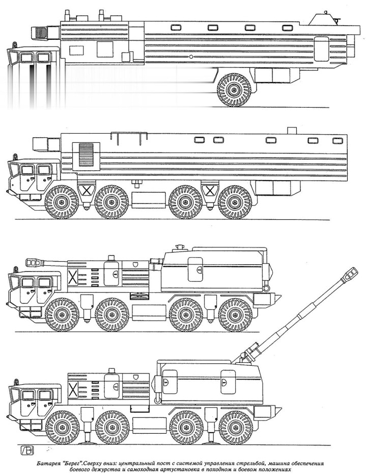 “沿岸”A-222复合系统的构成:战役值班保险车、中央迷惑站和130毫米自行火炮(SAU)