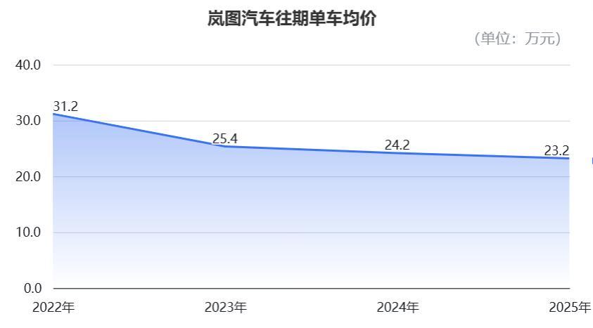 低能蓄意,岚图汽车的单车均价,在2022年、2023年、2024年以及2025年永诀为31.2万元、25.4万元、24.2万元和23.2万元。