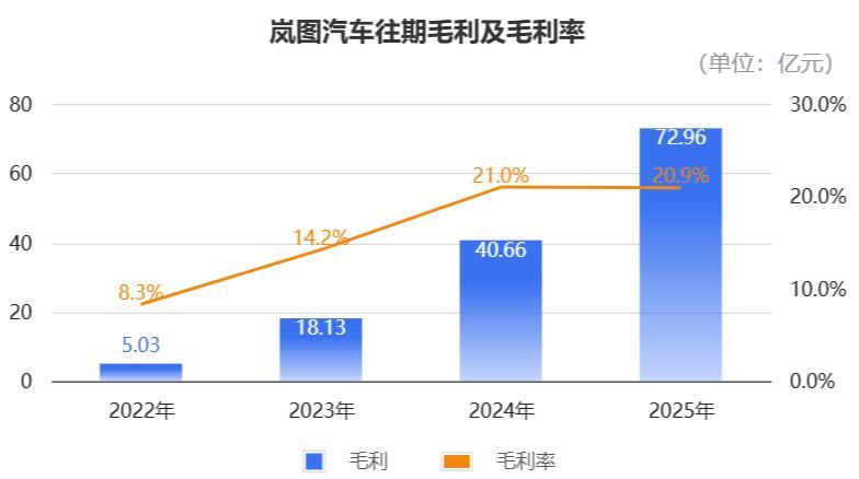 2022年到2025年,岚图的毛利永诀为5.03亿元、18.13亿元、40.65亿元和72.96亿元。