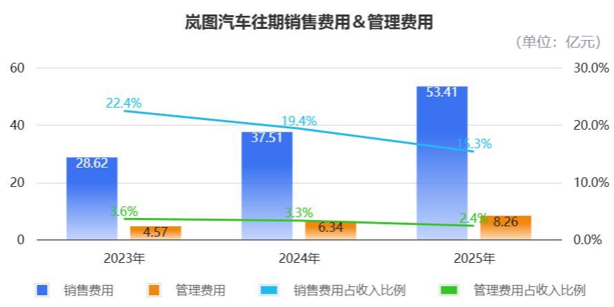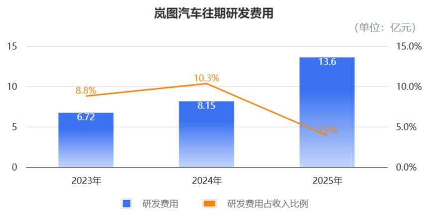 “三费”当中,2023年到2025年,岚图的研发用度永诀为6.72亿元、8.15亿元、13.6亿元,占总收入的比重永诀为5.3%、4.2%、3.9%,不错看到研发成果有提高走势。