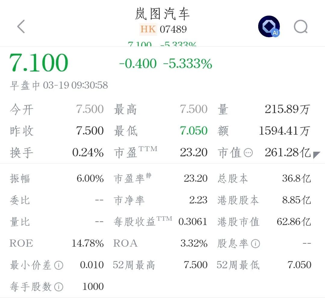 东风旗下岚图汽车,当天适应登陆港交所,开盘价7.5港元/股,开盘市值259.4亿港元。但开盘即破发走低……