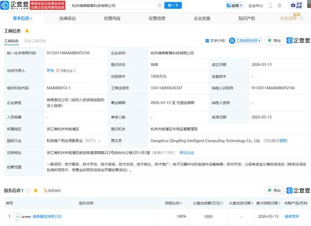 企查查APP认知,近日,杭州清鼎智算科技有限公司建造,法定代表东谈主为罗尧,开云kaiyun(中国)注册成本为1000万元,研讨领域包含:电子元器件与机电组件拓荒销售;软件开发;以自有资金从事投资看成等。企查查股权穿透认知,该公司由通鼎集团有限公司全资合手股。