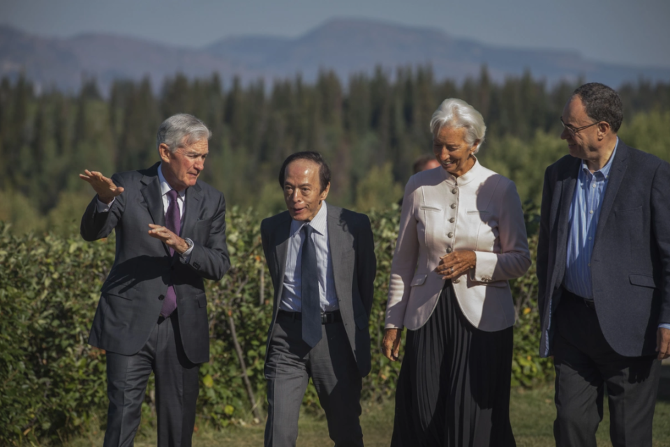 2025年8月22日,好意思国怀俄明州莫兰,好意思联储主席杰罗姆·鲍威尔与日本银行行长植田和男、欧洲央行行长克里斯蒂娜·拉加德、英国央行行长安德鲁·贝利