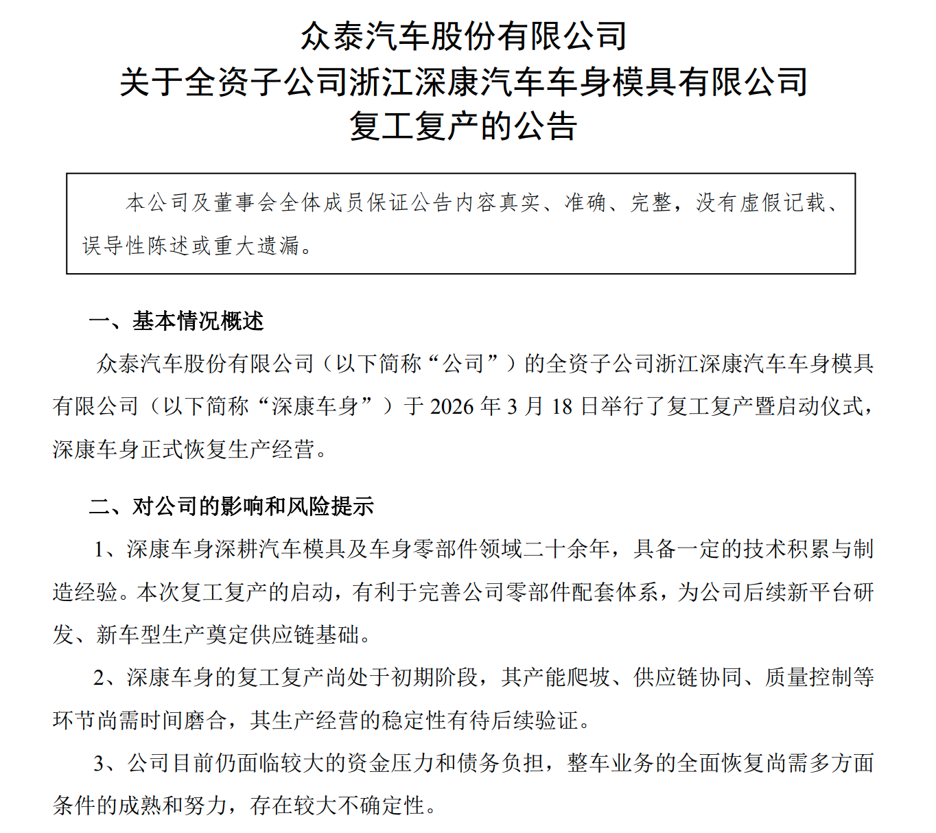 3月18日,众泰汽车(000980.SZ)发布公告称,公司全资子公司浙江深康汽车车身模具有限公司(简称“深康车身”)于3月18日复工复产,厚爱复原坐褥规画。