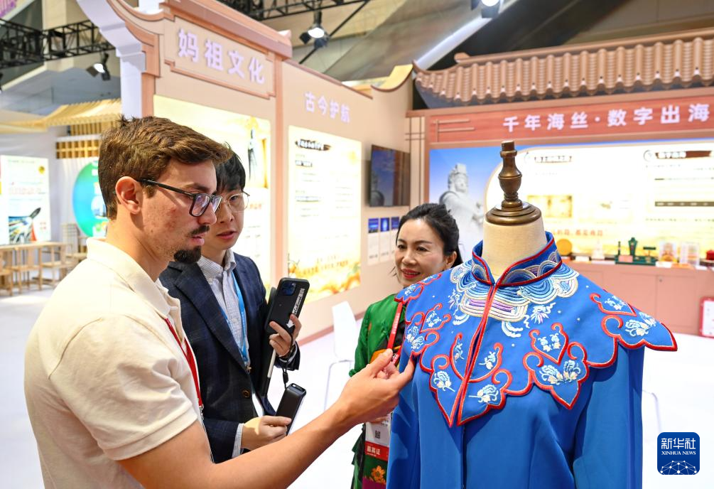 3月18日,开云·体育巴西来宾(左一)在妈祖文化主题专区了解性格衣饰。