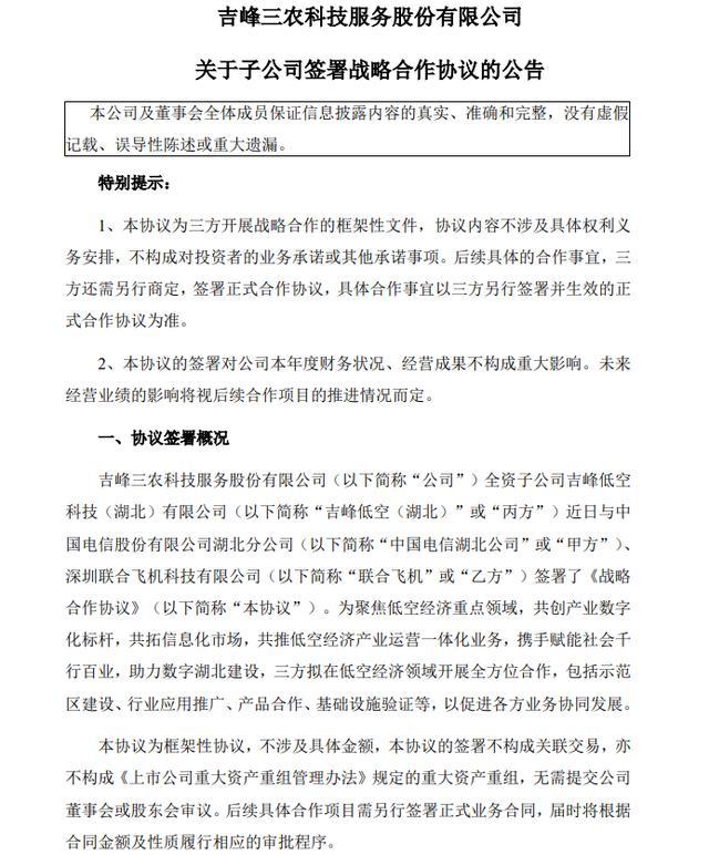 3月18日,吉峰科技(300022.SZ)公告称,公司全资子公司吉峰低空科技(湖北)有限公司与中国电信(601728.SH)湖北分公司、深圳集合飞机科技有限公司签署《战术调解左券》,拟在低空经济界限开展全主张调解。调解推行包括集合打造无东说念主机期骗场景示范基地、深度拓展低空经济行业限制化期骗、协同开展低空基础次第与建设性能考据等。