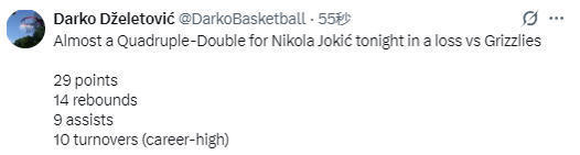 北京技能3月19日,NBA老例赛络续进行,掘金队118-125不敌灰熊队。约基奇此役出战39分钟,19投11中获取29分14篮板9助攻1抢断3盖帽,还出现了10次相当(平做事生存最高),差点砍下了四双。