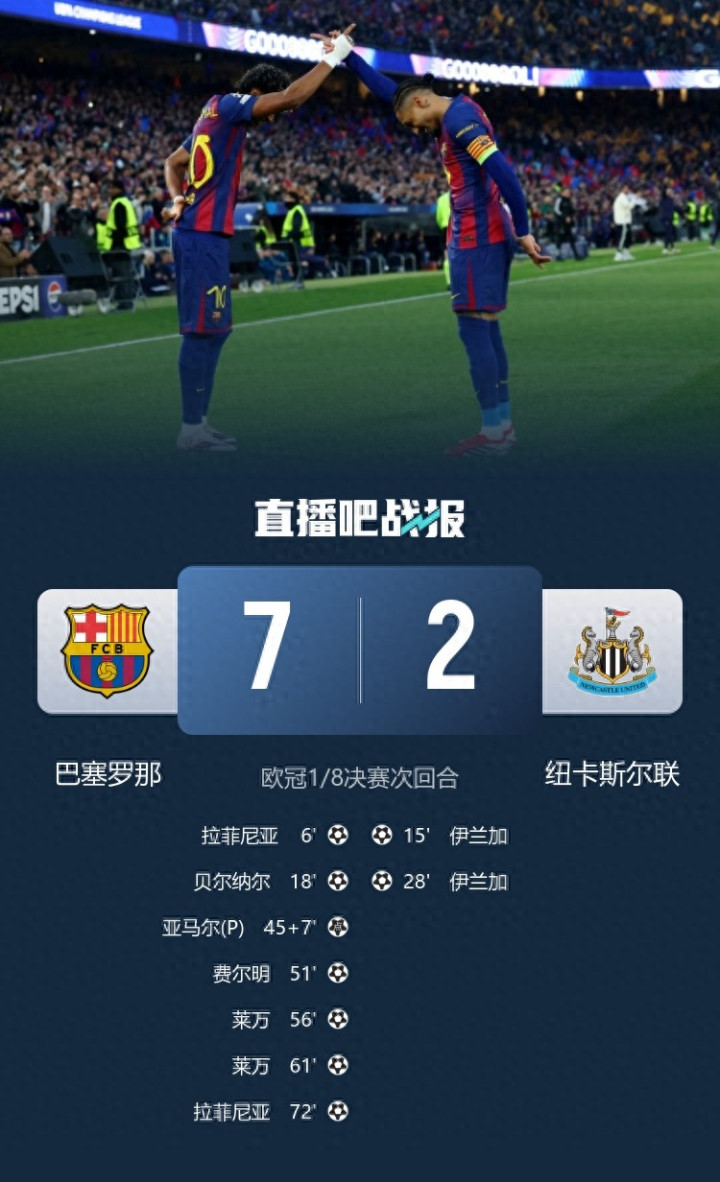 直播吧3月19日讯 北京技巧3月19日凌晨1:45,欧冠1/8决赛次回合,巴塞罗那镇守诺坎普球场迎战纽卡斯尔联,首回合两队1-1战平。上半场拉菲尼亚破门,伊兰加扳平,贝尔纳尔进球,伊兰加再度扳平,补时阶段特里皮尔拉倒拉菲尼亚送点,亚马尔点射,巴萨暂3-2纽卡斯尔联;下半场拉菲尼亚1球2助,费尔明破门,莱万双响,最终巴萨7-2纽卡斯尔联,总比分8-3晋级8强,将对阵热刺与马竞间的胜者。